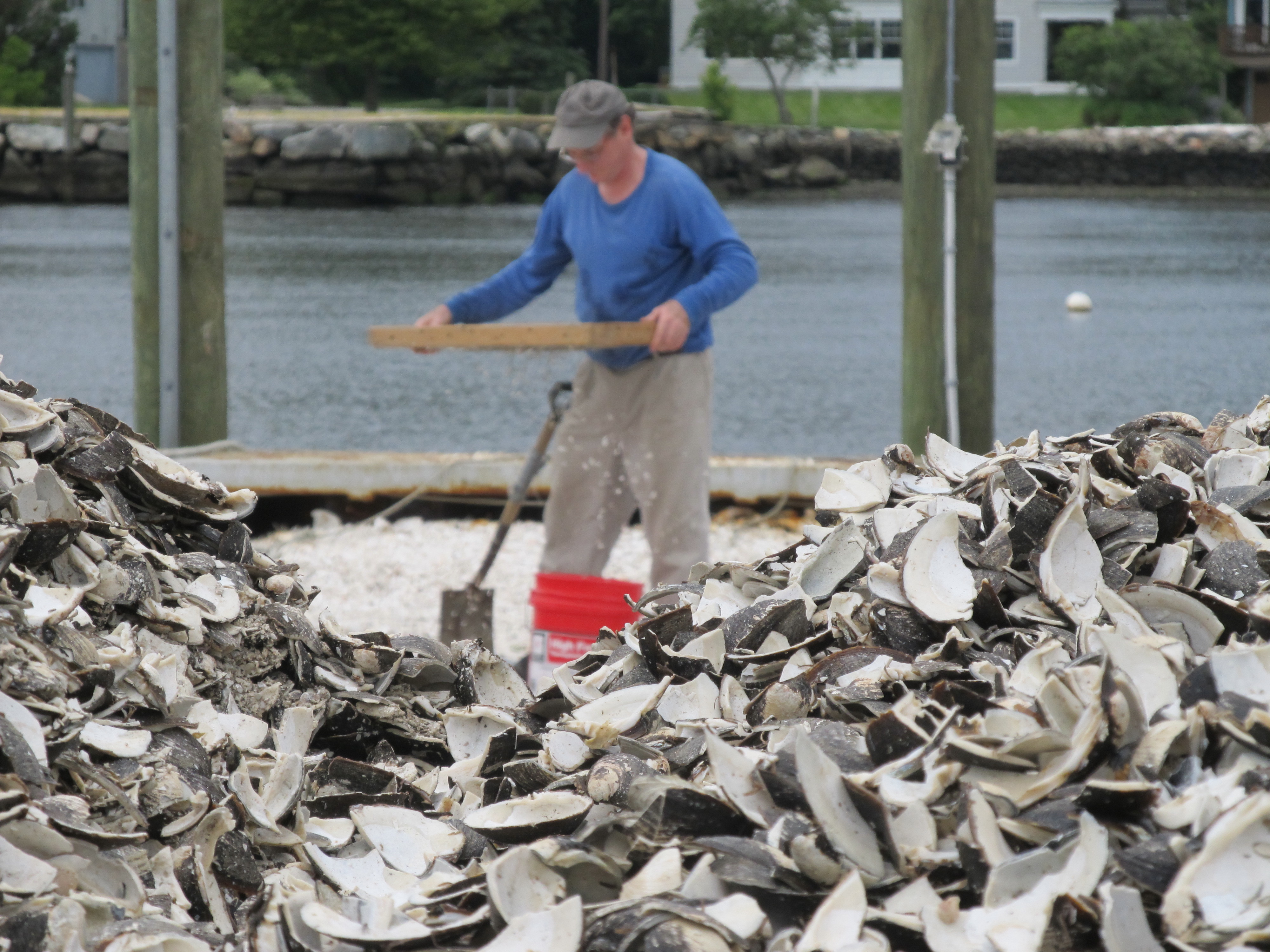 I go to the coast of New England to source oyster shells, which I crush and grade myself. This is the recycled waste from the seafood industry. Oyster shells are wonderfully variegated, and take a nice polish.