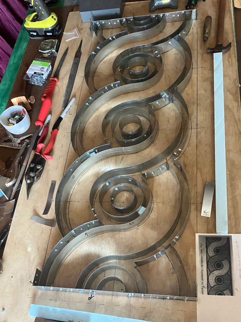 Using 1-1/2 inch strips of galvanized sheet metal, I am forming circles using my slip roll. All elements will be cold connected using stove bolts and threaded rods. This mould is essentially a cookie cutter that will help me to “print” an image. Metal fabrication is one of the hidden skills within precast terrazzo.