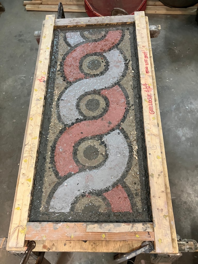 The various wet terrazzo mixes are placed and finally the mould is carefully removed, leaving this mosaic “print.” (left) The piece is damp cured for several days and then allowed to dry out completely over several more days.