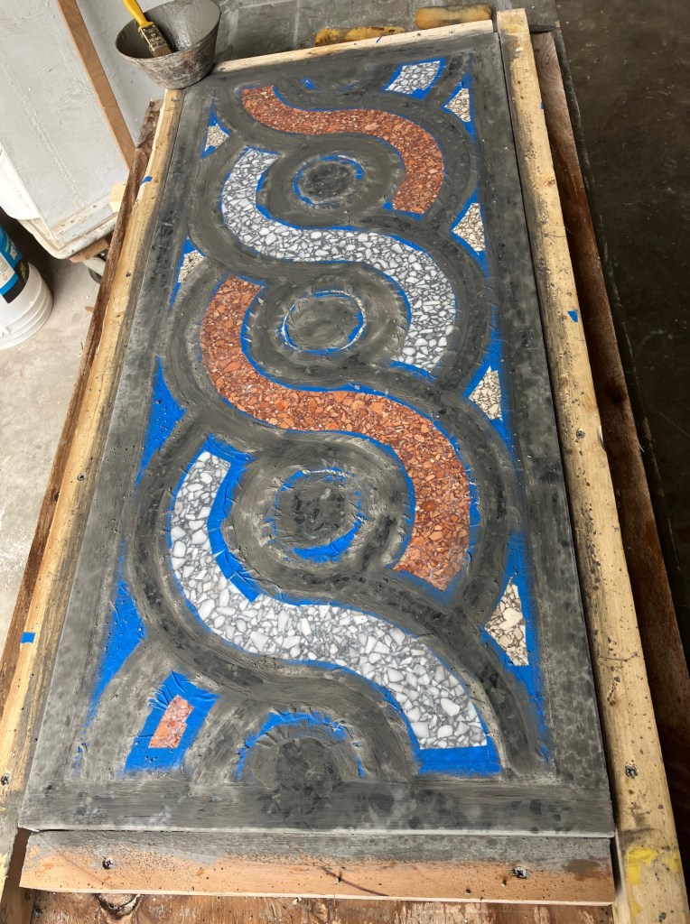 The color samples are done to lock in the mineral pigment recipes and to ensure good contrast between bordering fields of terrazzo.